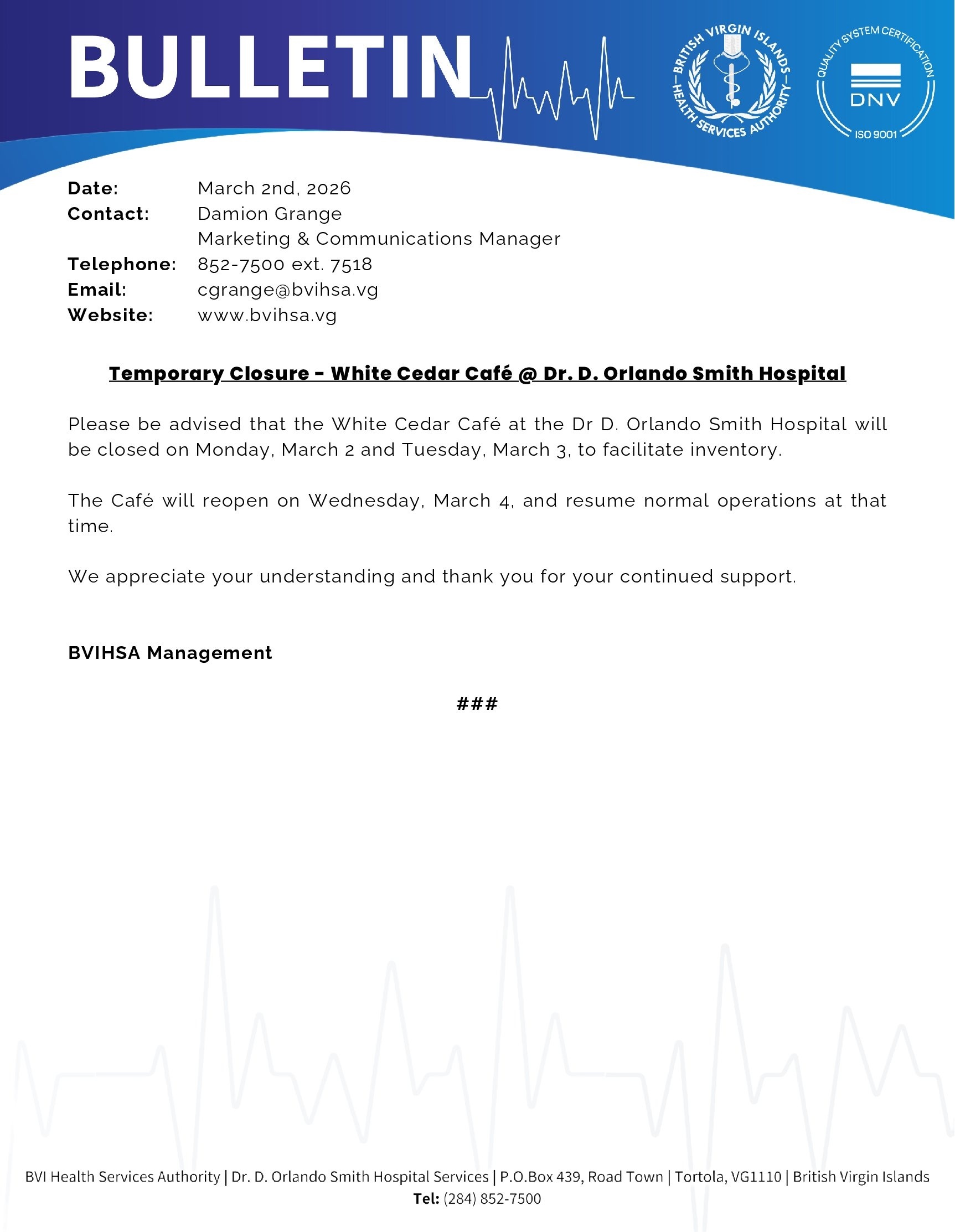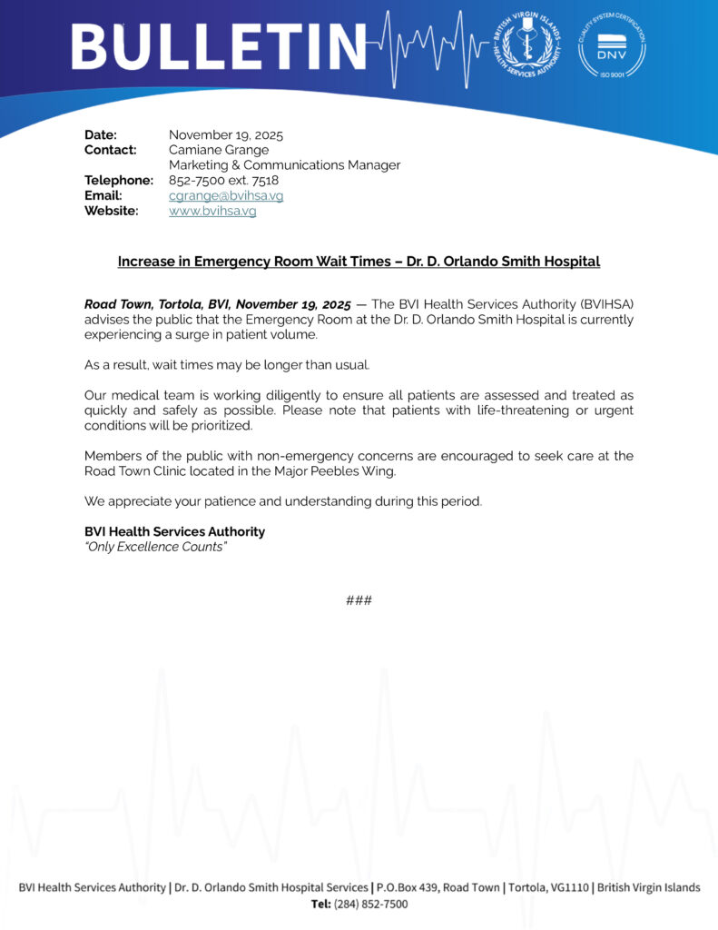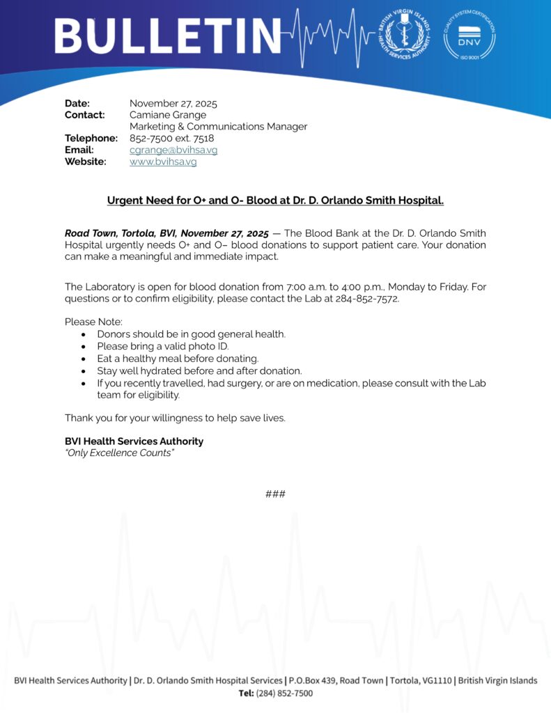 BVIHSA Announces Temporary Service Changes at the Nurse Iris O’Neal Medical Centre as Rehabilitation Efforts continue. British Virgin Islands – October 16, 2025 – The British Virgin Islands Health Services